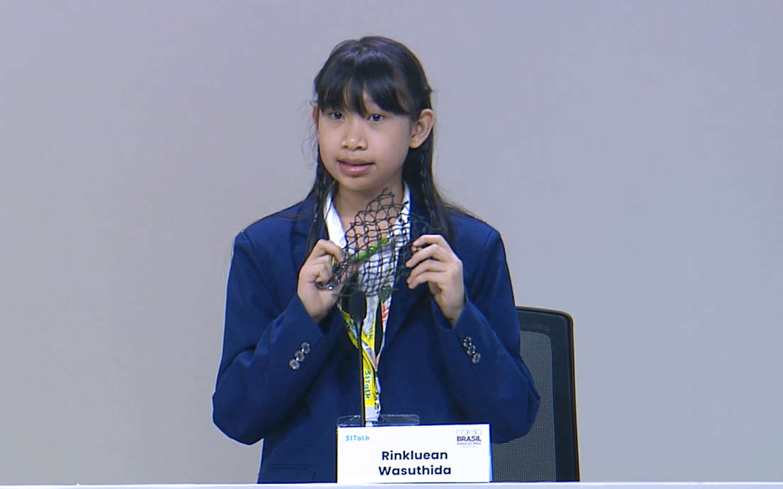 At COP30, she used the image of a sea turtle trapped in a ghost net to illustrate marine plastic pollution and its long-term impact on ocean ecosystems and human health, emphasizing the need for awareness and action to protect the oceans. Representing Thailand for the first time on an international platform, Wasuthida demonstrated determination, confidence, and a commitment to contributing to a greener future.